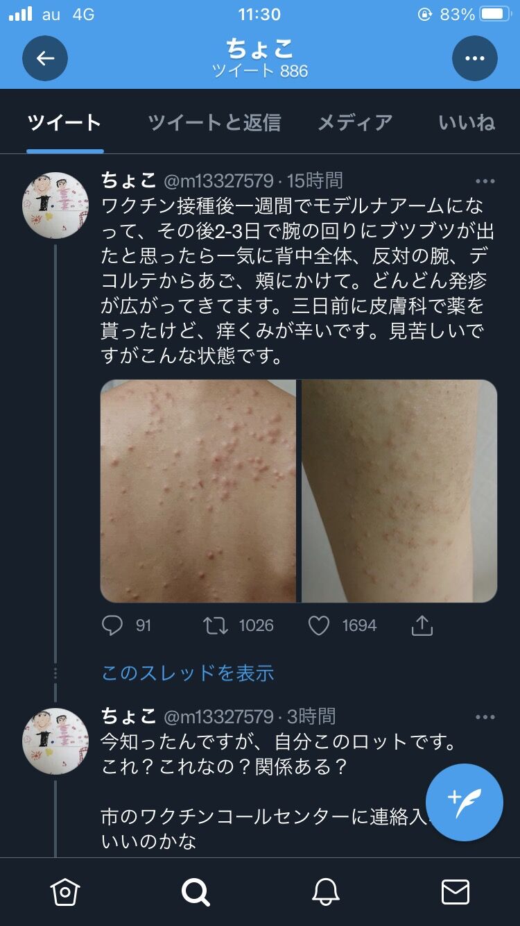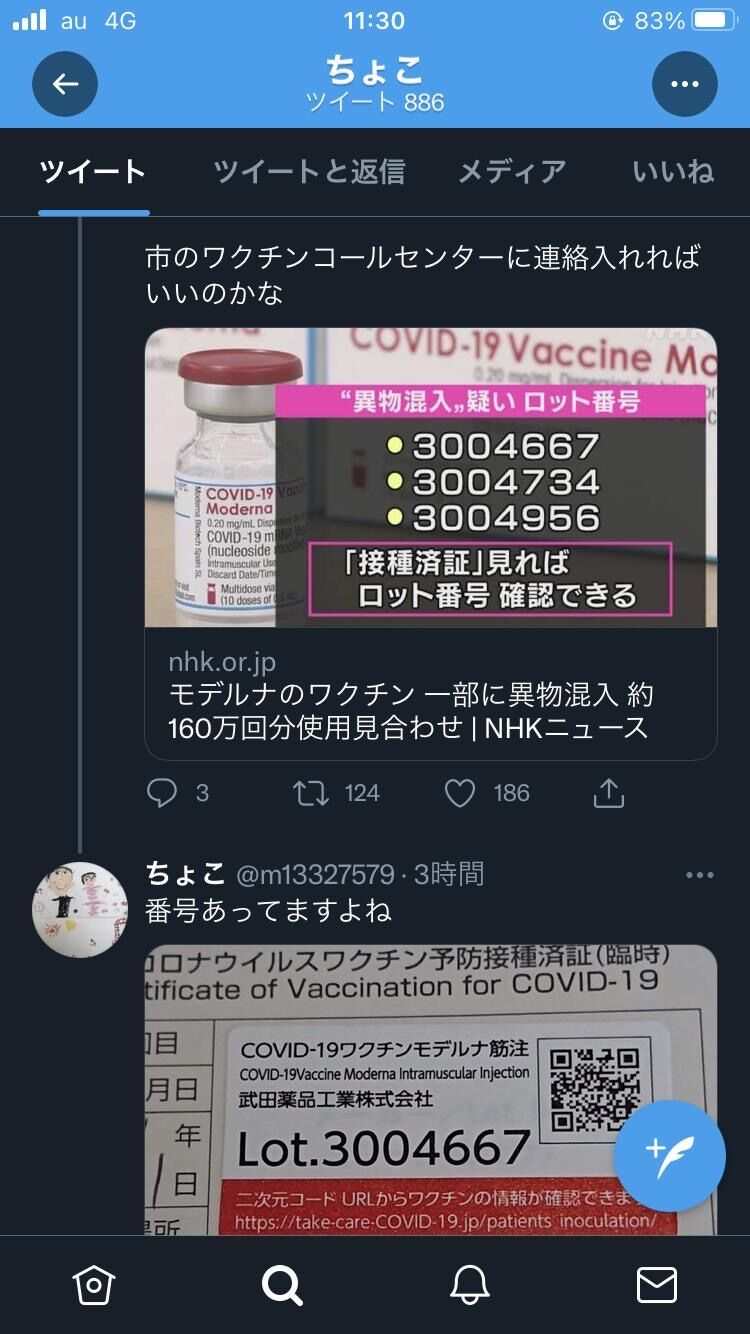 モデルナ社製ワクチン、6月にはすでに異物混入か… 武田薬品に報告していた1 2021/08/27(金) 12:23:45.89このうち、さいたま市浦和区の「県南部ワクチン接種センター」では、8月10日に届いたロット番号「3004667」のおよそ700本のうち19本で異物混入が確認され、流通を手がける武田薬品工業·newsoku.blog·Aug 27, 2021モデルナ社製ワクチン、6月にはすでに異物混入か… 武田薬品に報告していた
