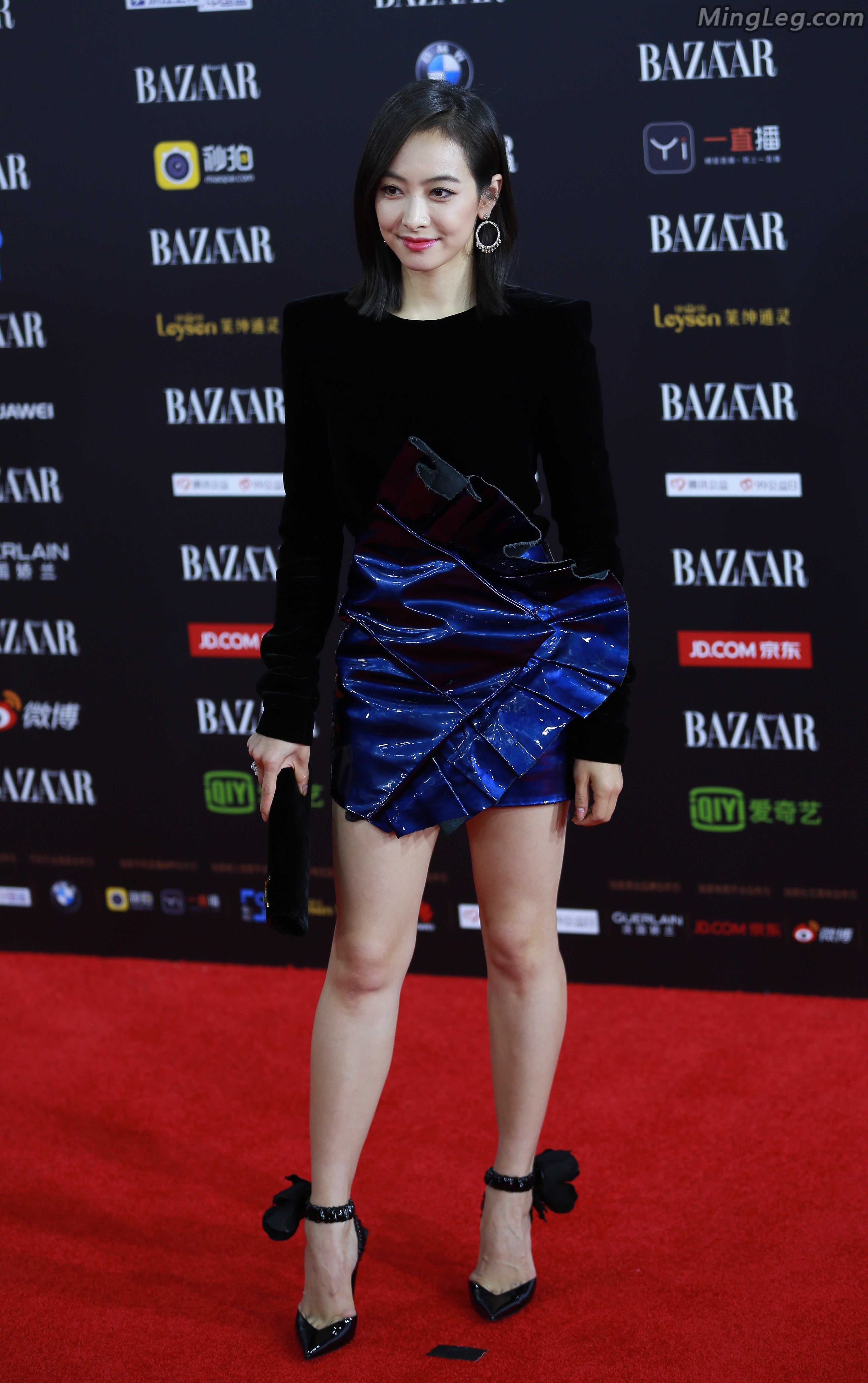 宋茜身穿玫瑰色露腿长裙脚踩个性紫色高跟