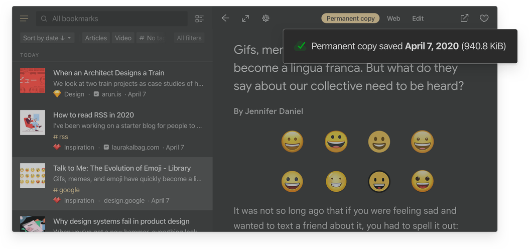 Raindrop automatically creates copies of all web-pages and files in your collection.