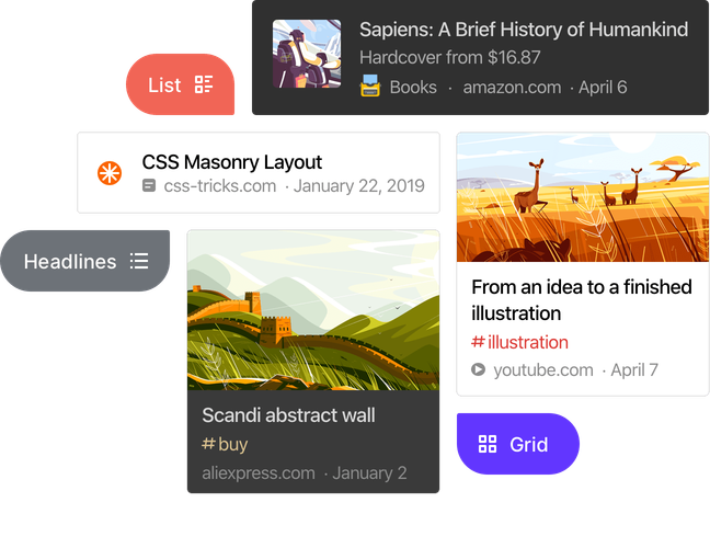 View bookmarks the way you like. We have Grid, Headlines, Masonry, or List view modes. Learn more